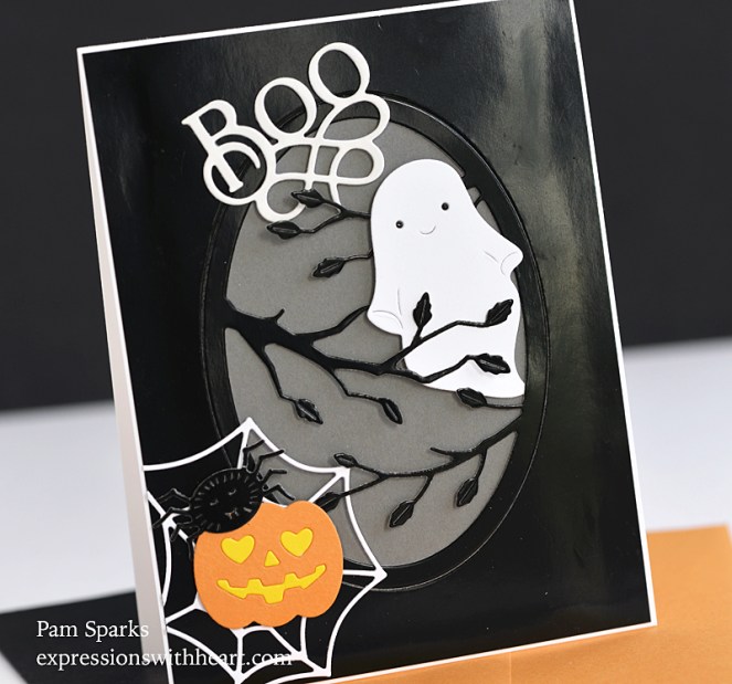 Here’s the Memory Box Black Glossy cardstock out to play again!  I used white glossy on the Boo but it’s hard to tell it in the pictures.  I should’ve used it on the ghost and cobweb too! lol