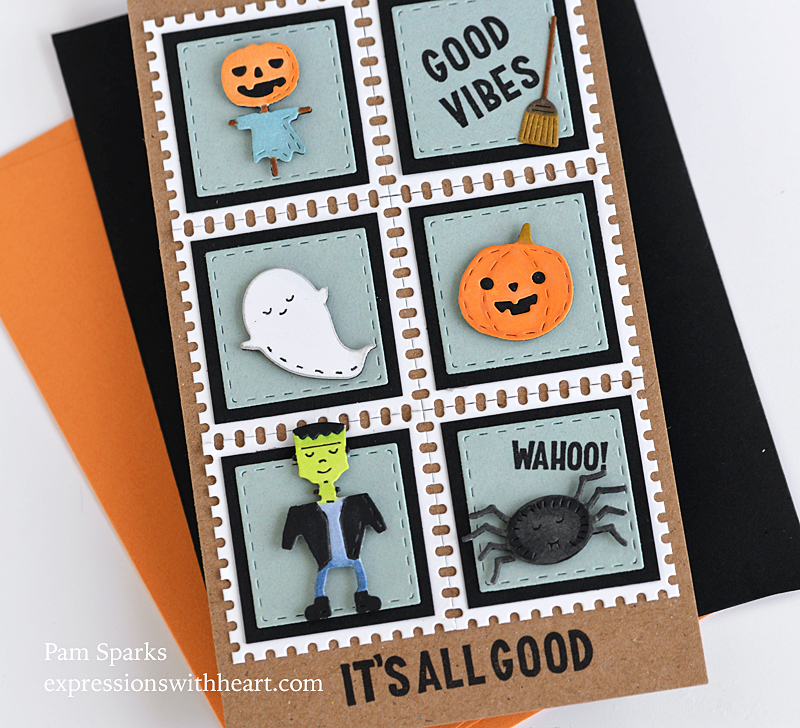I decided to go postal!  Memory Box Postage Square Layers for the white layer, Stitched Square Layers for the bluish green layer.  I had to cut the black layer with a paper trimmer.