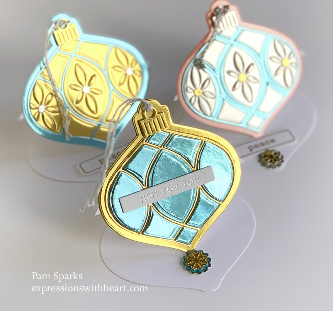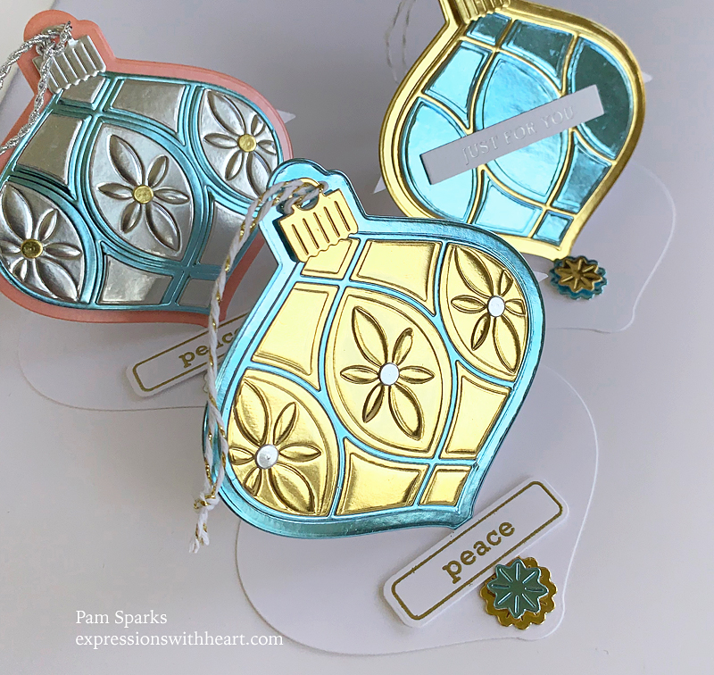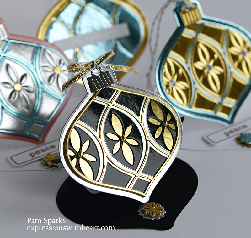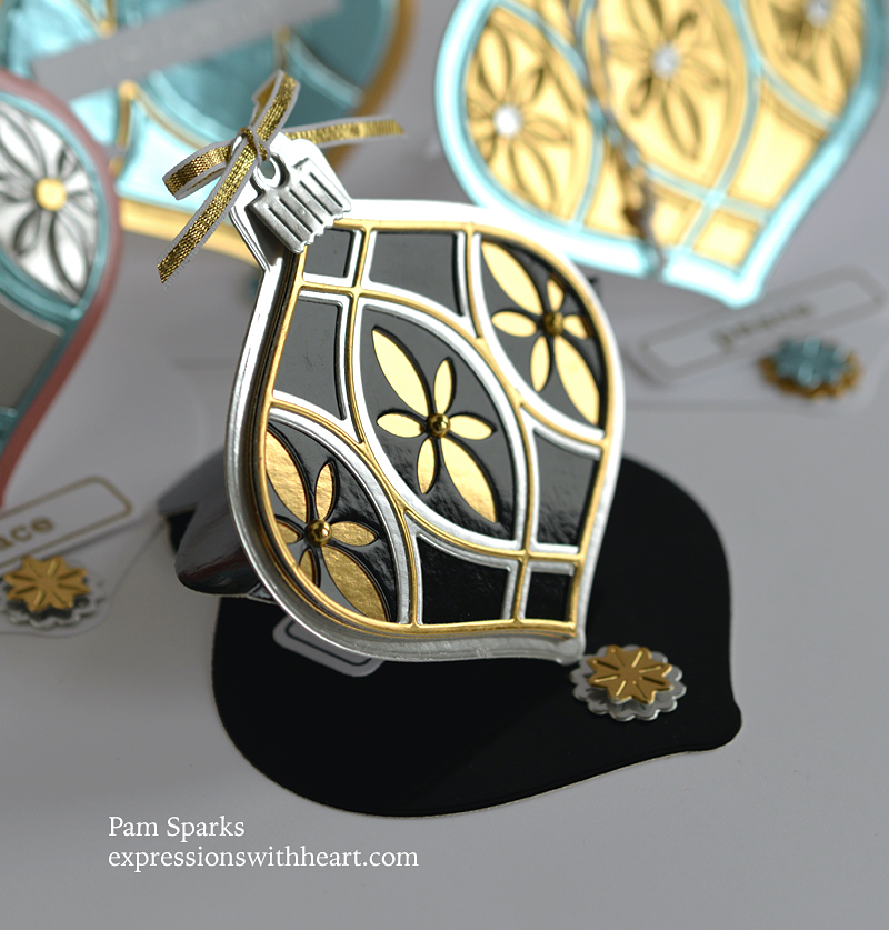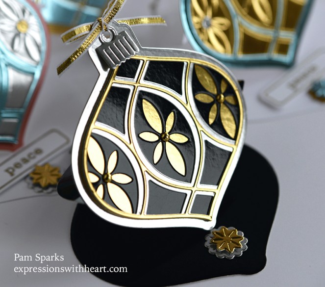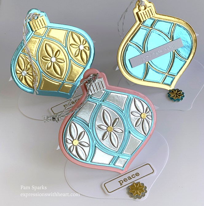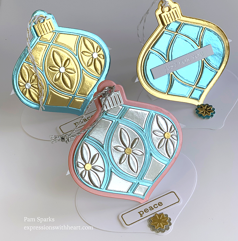Hi everyone! I have four easel cards to share with you today. As I was making these, thinking about how fun and easy, it hit me how cute they would be for table place cards! They would be beautiful just using the ornament part and hanging on a tree or used for a gift tag with a beautiful bow!