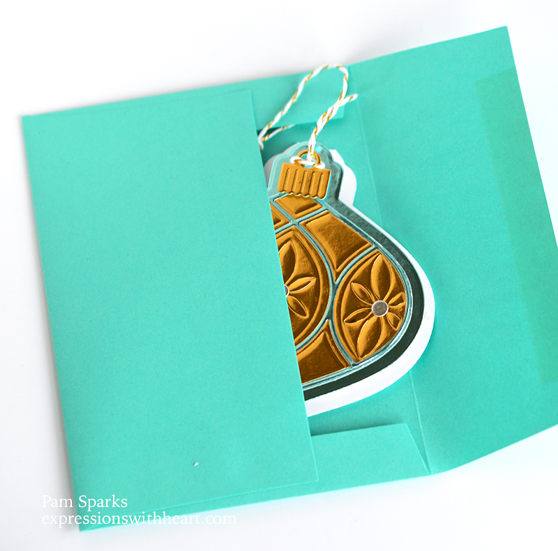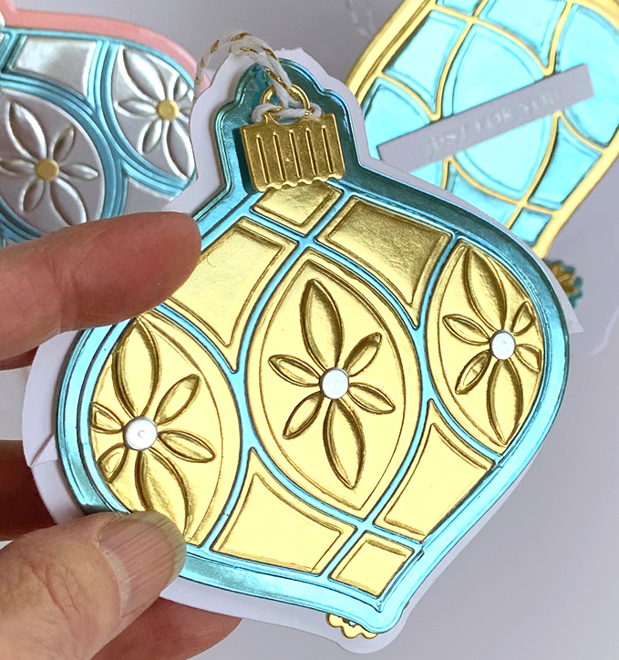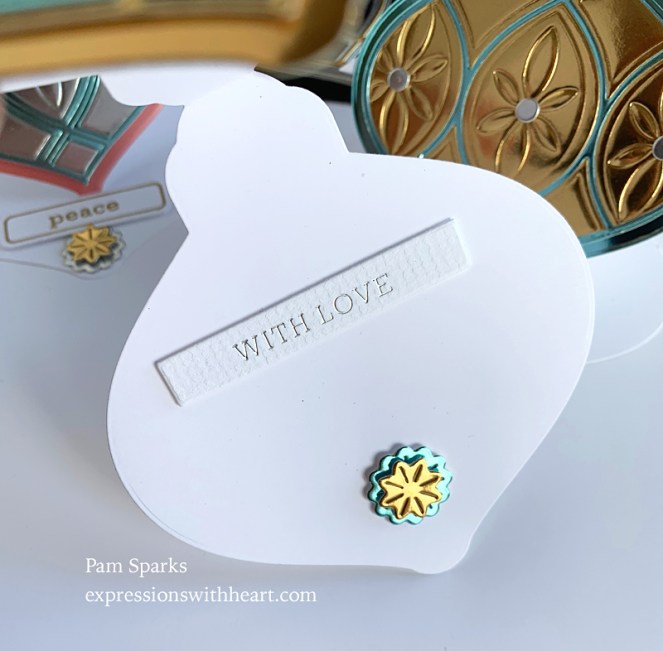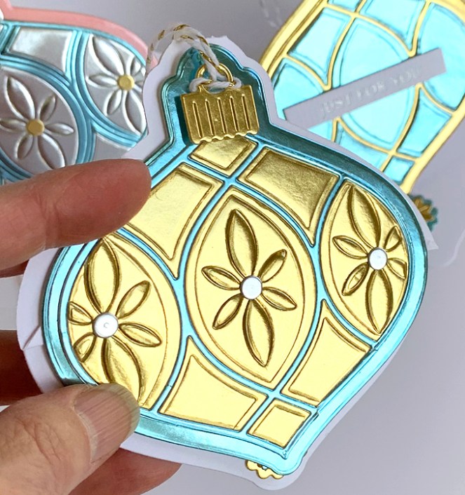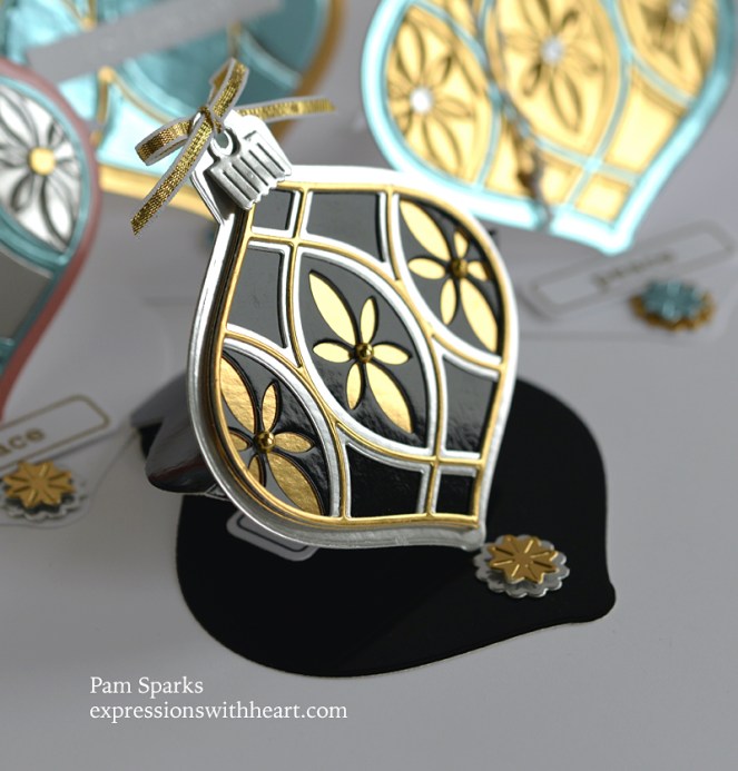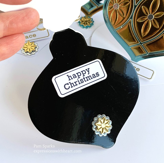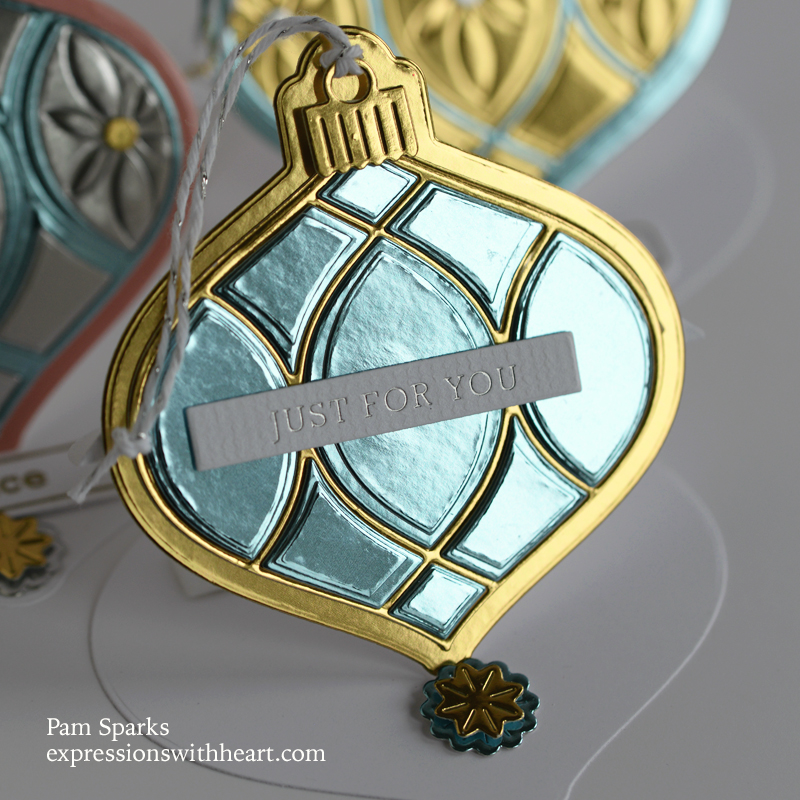 Hi everyone! I have four easel cards to share with you today. As I was making these, thinking about how fun and easy, it hit me how cute they would be for table place cards! They would be beautiful just using the ornament part and hanging on a tree or used for a gift tag with a beautiful bow!
