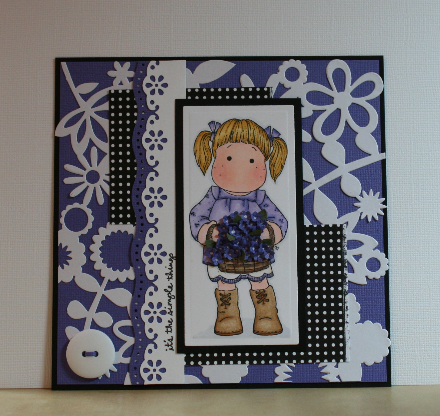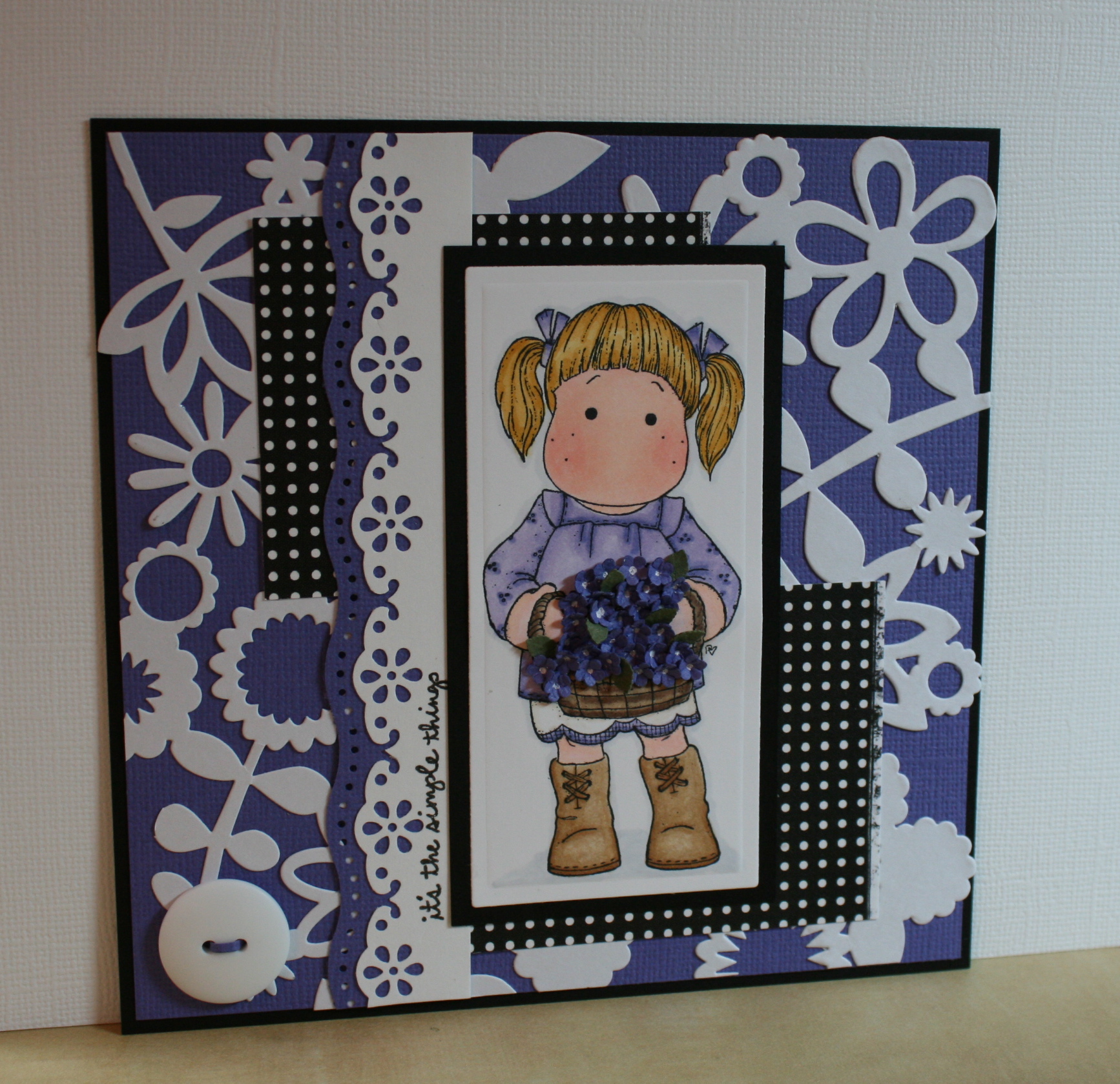 I used Grape Bazzill card-stock, KI Memories flower die cut 12×12 paper, Lasting Impressions for Paper black polka dot, Beckett Expression Radiance card-stock to stamp and color my Magnolia Tilda flower girl, All Night Media flower border punch, Martha Stewart border flower punch and the EK Success wavy border punch.