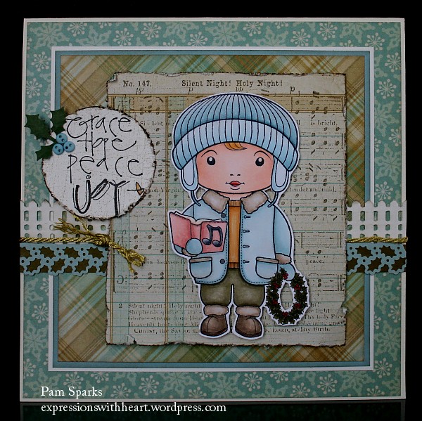 Today I inked up Caroling Luka from La-La Land Crafts, HERE, colored him with copics, some We R Memory Keepers papers, Magnolia Silent Night stamp, Martha Stewart border punches, Marvy Uchida Holly craft punch, Lasting Impressions teeny buttons, Me and My Big Ideas gold cord and Printworks new sentiment, D3940 – Grace Hope, HERE.