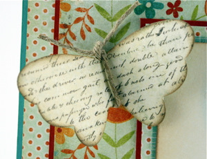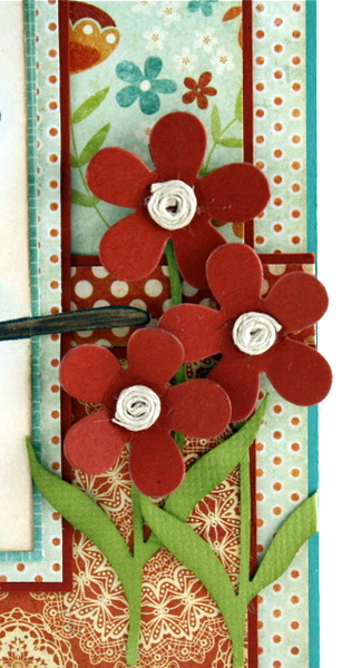 My techniques for today’s card are masking, distressing with the Tim Holtz paper distresser and distress ink and ink blending tool, stitching with the sewing machine and embellishing die cuts. I used the Tim Holtz sewing border die. I cut it out of mirror card-stock and kraft card-stock… trimmed off the different pieces and layered them up. Wound buttonhole thread around the spool a couple times. The sentiment is an old Hero arts stamp… love it!