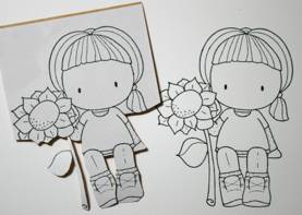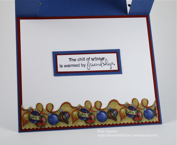 I inked up the Stone Wall stamp and wiped away the butterflies, flower and grass, stamped it, inked it up again and wiped away then stamped with the stamp a ma jig to position them right the two images tight up against each other. All I had to do was draw in a few lines then…I stamped a light dot pattern from Printworks with Pumice Stone Distress ink after I colored the wall with warm gray copics. The background sky is Chipped Sapphire Distress ink applied with the Tim Holtz ink blending tool on a craft sheet. A few light spritzes with H2O and some teeny snowflakes and fine glass glitter from the Art Glittering System. The snow on the trees is a Snow Marker from Marvy and a little fine glass glitter again. The chipboard Christmas pieces are from K & Co. Brenda Walton Evergreen Icons. The border piece inside is from K & Co. Elizabeth Brownd Visions of Christmas border pack.