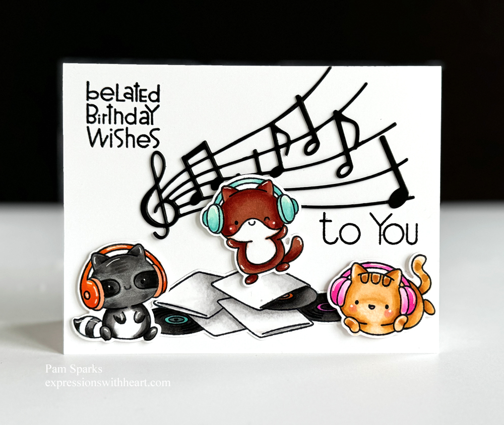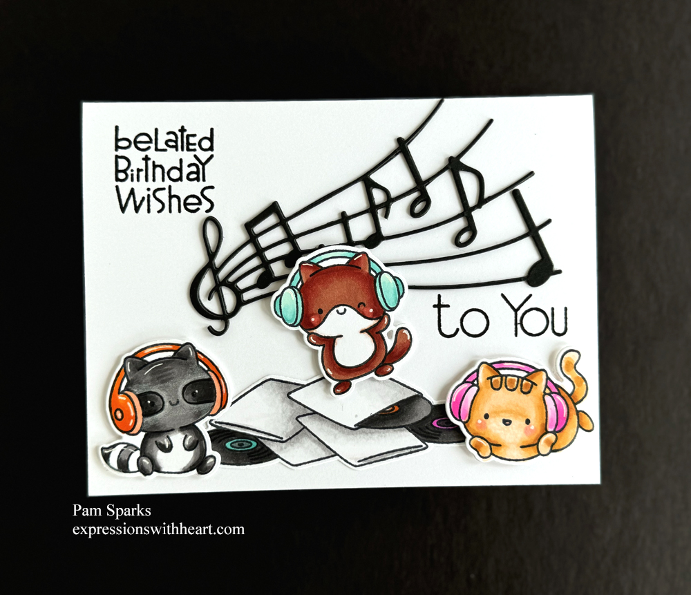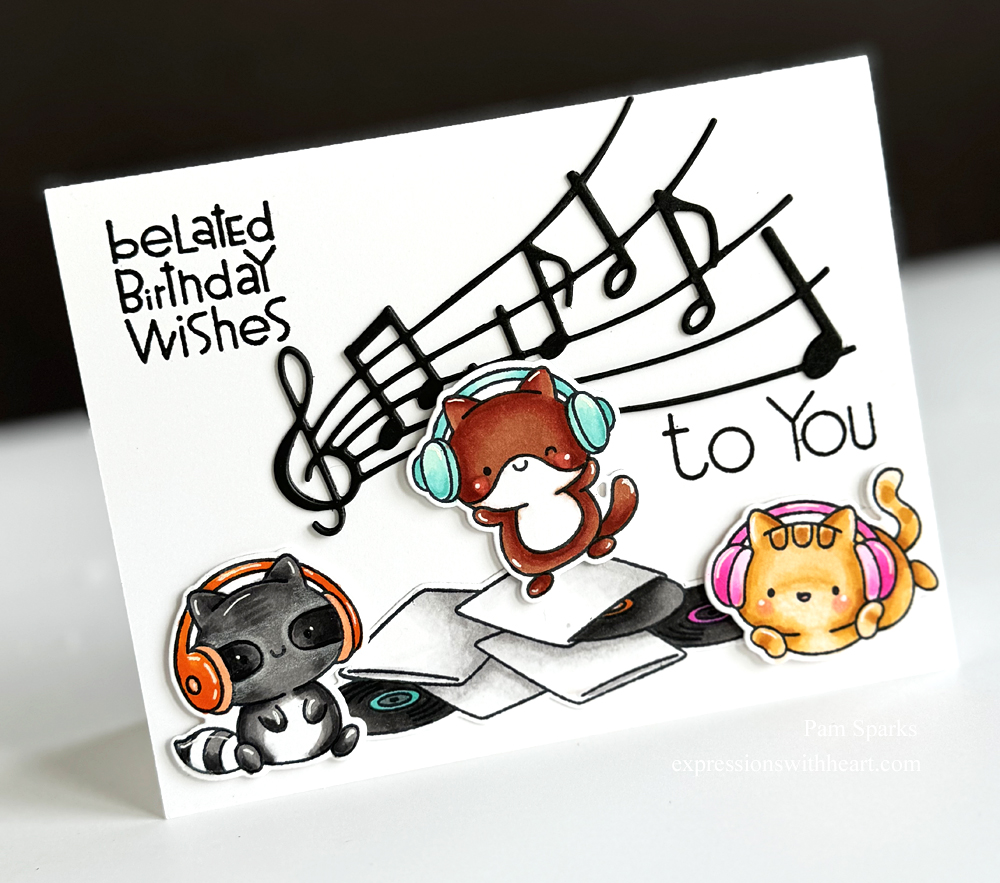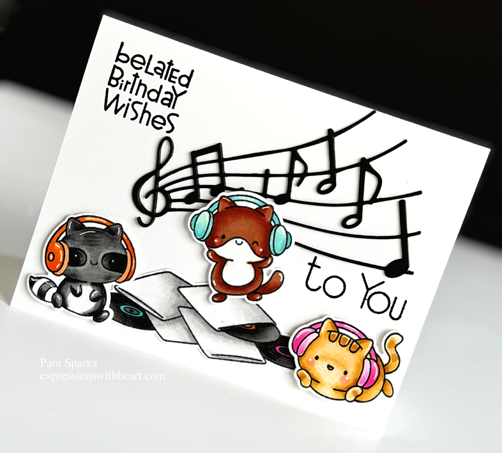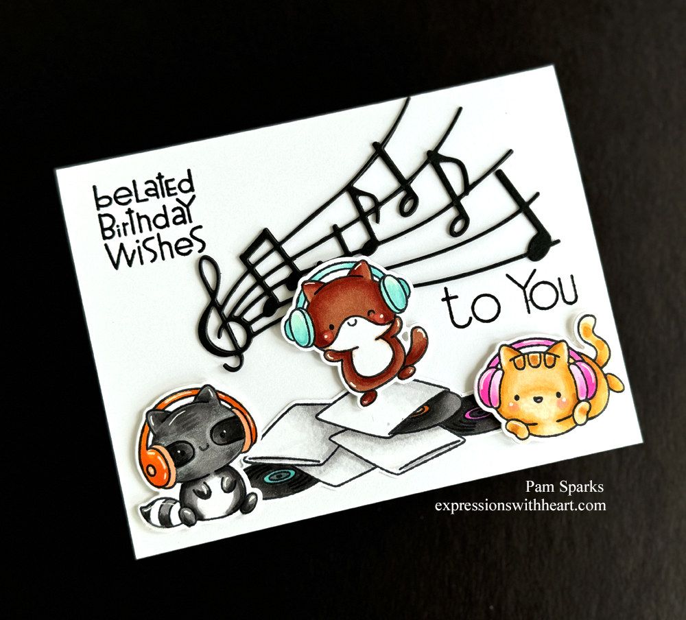 I stamped them in the MISTI with Memento Tuxedo Black ink and colored them with Copic Sketch Markers. A little white gel pen added after coloring. What a happy musical trio!