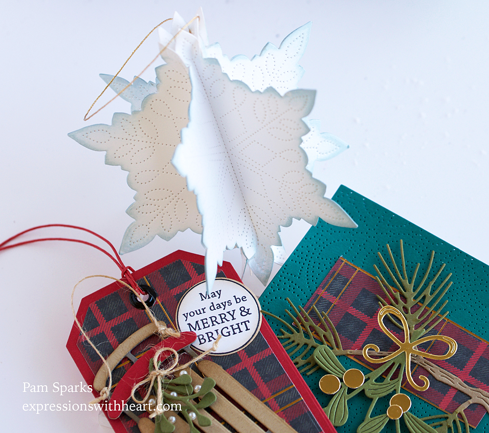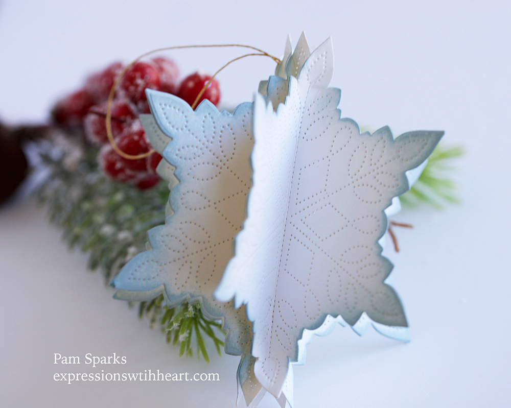 I posted a snowflake ornament on Instagram not realizing the die was discontinued.  So I decided to use this new die from Birch Press Design to make the same type… the pinpoint design of this Pinpoint Snowflake die makes it really easy to do… you don’t even have to score the center lines, you just fold right on the dots!  I used six die cuts in white cardstock and ink blended on the edges after it was glued together.