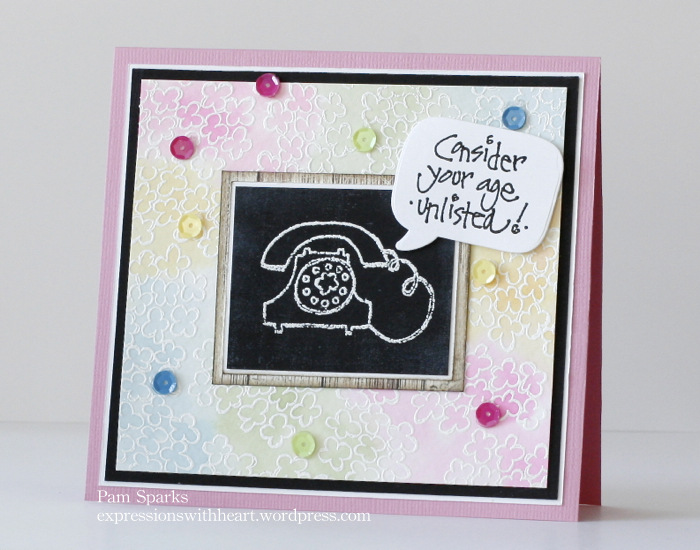 I love this sentiment from Printworks and use it anytime I use a telephone! This adorable telephone image and the floral background stamp are NEW and also from Printworks. I embossed the telephone and the flowers (multiple times) with white pigment ink and Tsukineko’s Imagine White Embossing Powder. The sentiment is stamped with black pigment ink and embossed with Tsukineko’s Imagine Black Embossing Powder. I die cut the sentiment with a die from Lawn Fawn.