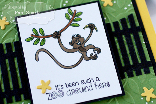 This cute little swinger is in the new TE Wild About You stamp set. Color with Copics and stamp a sentiment and you’ve got a quick card. There is a coordinating die set for it also.