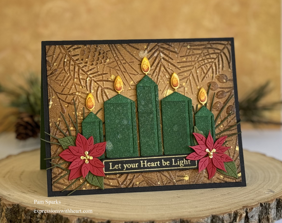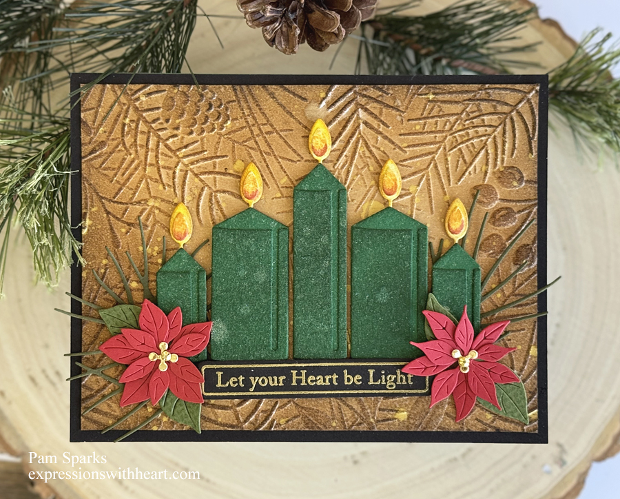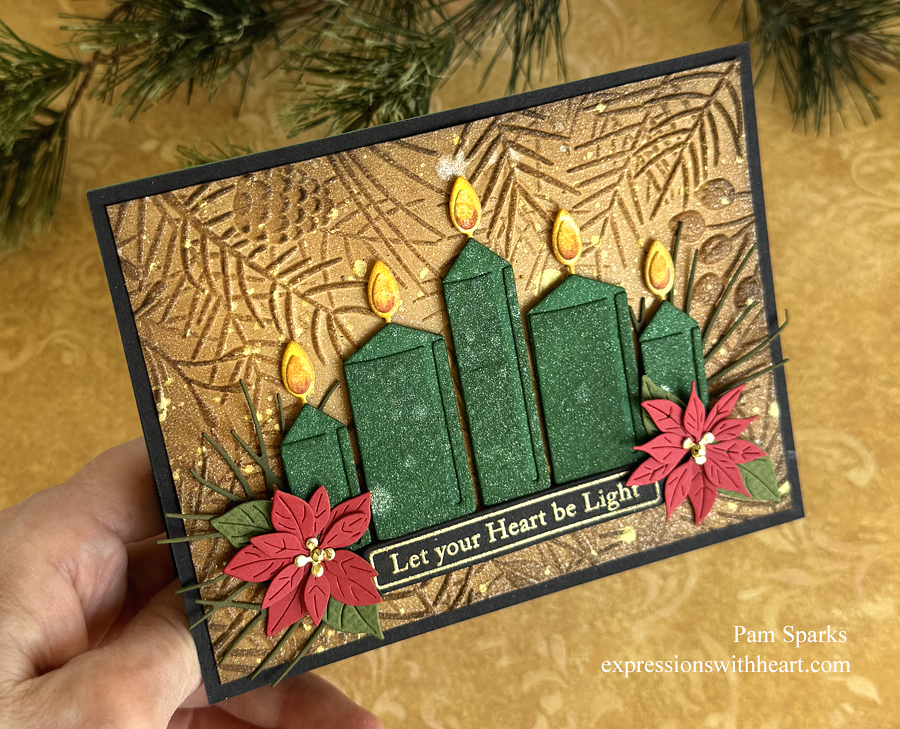 After I pieced the candles together I spritzed them with Sparkle Spray…they are really shimmery in person…the dots aren’t so dotty looking IRL. lol Left them to dry and worked on the background and poinsettias.