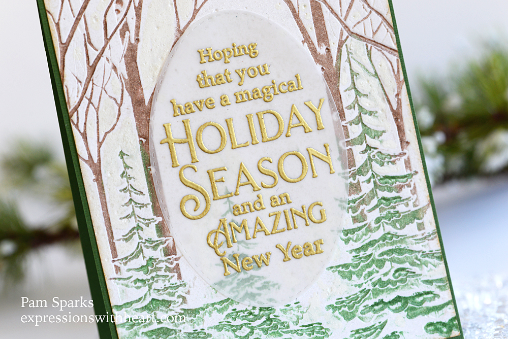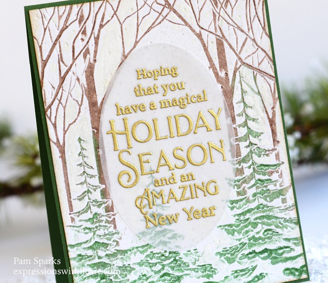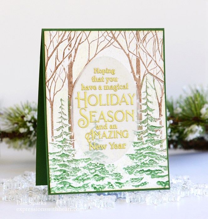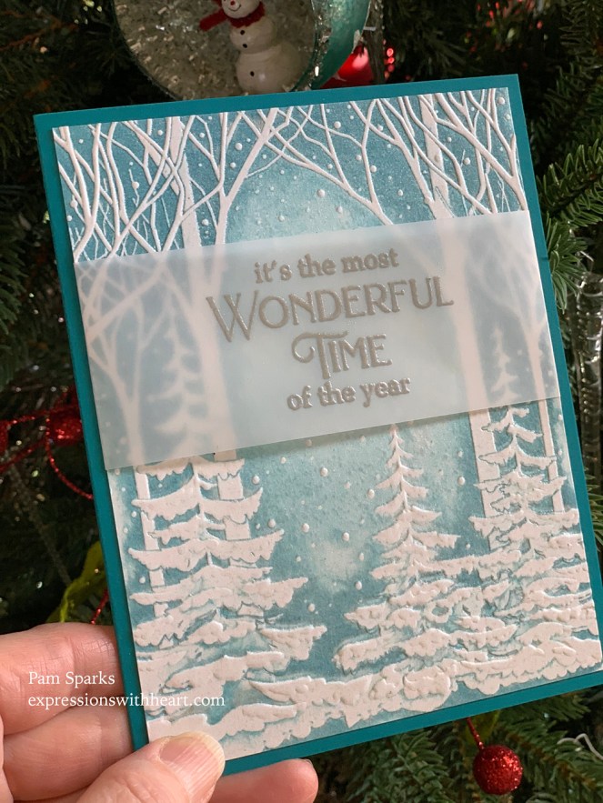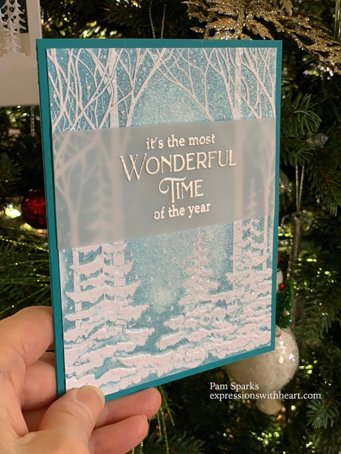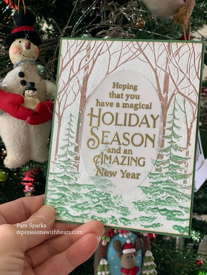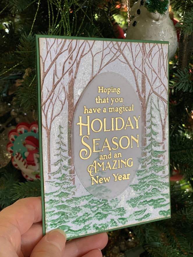 This one I inked with brown first, then green on the side where the trees are raised. Pretty cool… it’s tricky keeping the ink off where you don’t want it but what I finally ended up doing was using a white Posca pen over the ink marks, letting it dry before I sprayed it with Sparkle spray and then the vellum heat embossed gold sentiment over the top… disguised and pretty!
