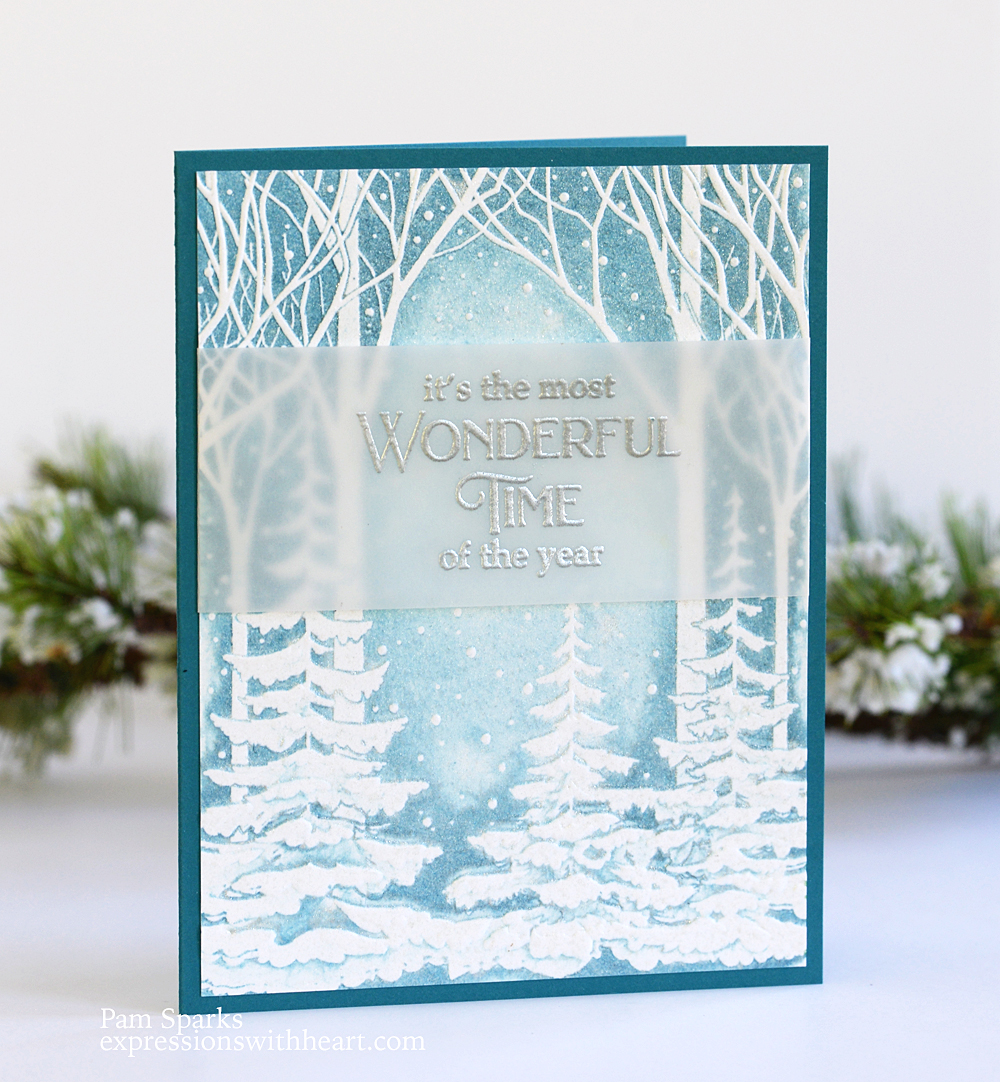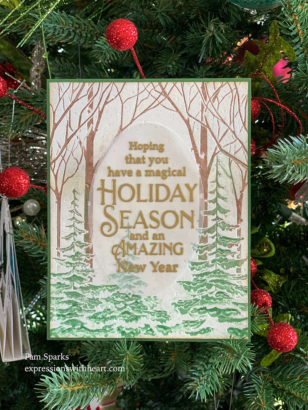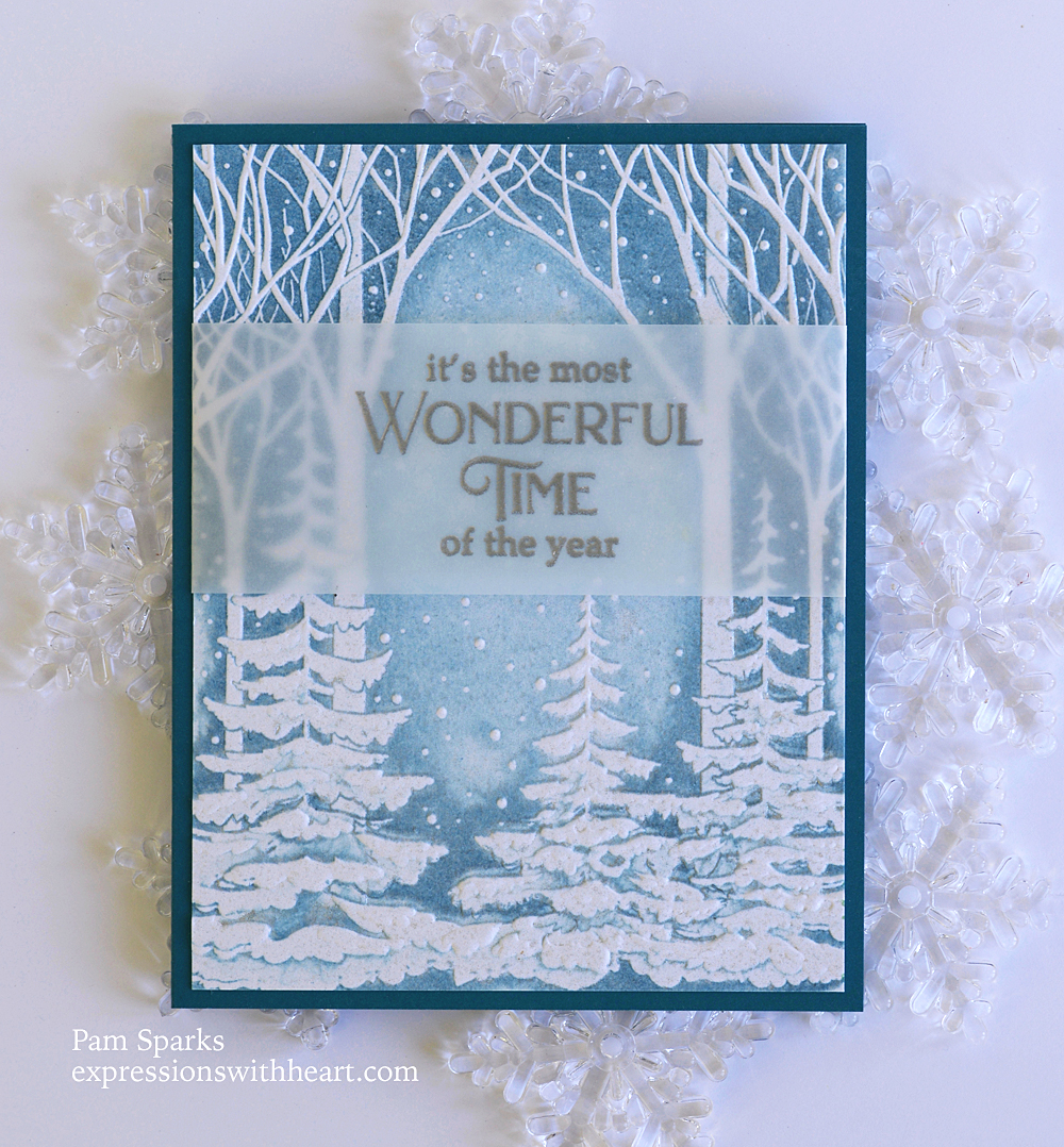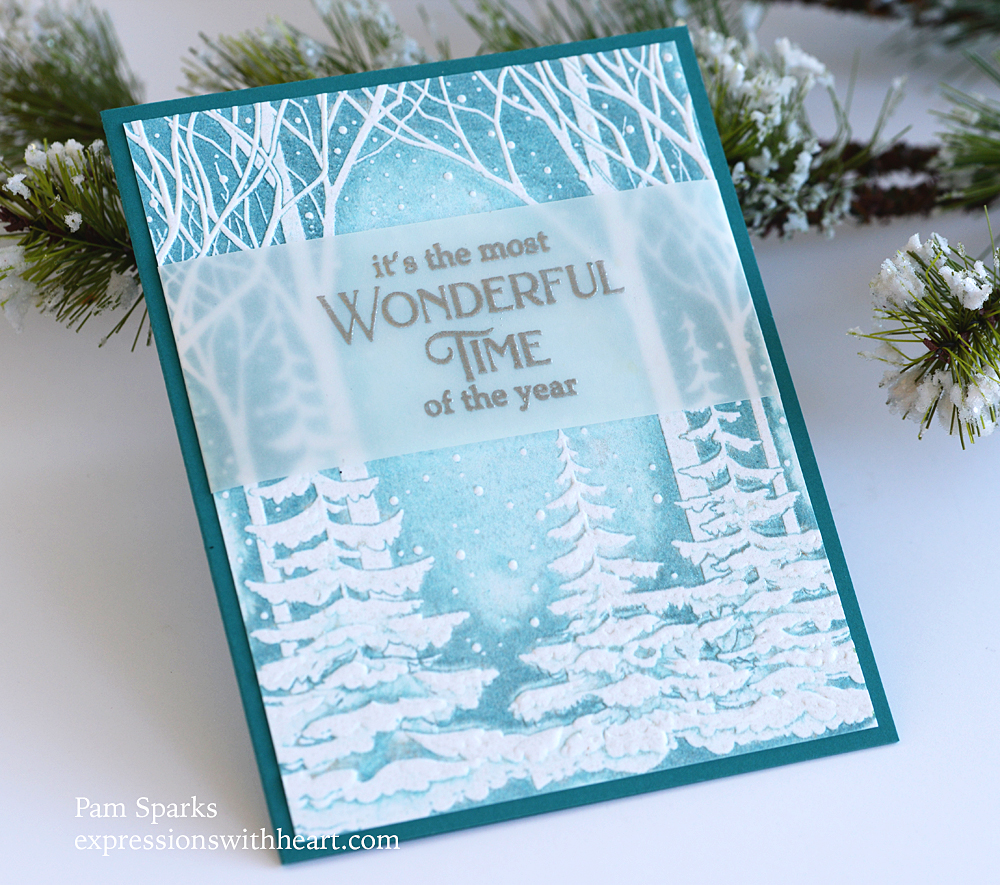This one I inked with brown first, then green on the side where the trees are raised. Pretty cool… it’s tricky keeping the ink off where you don’t want it but what I finally ended up doing was using a white Posca pen over the ink marks, letting it dry before I sprayed it with Sparkle spray and then the vellum heat embossed gold sentiment over the top… disguised and pretty!