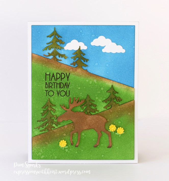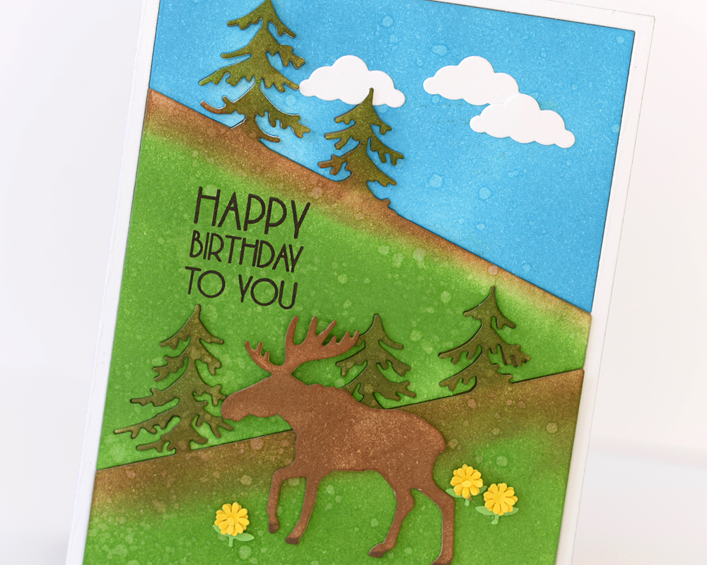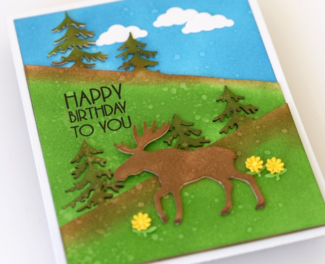 I had some inky fun with this poppystamps Mountain Hills Plate. I love that you get the ⅛ inch frame that cuts separate with this die! And really, you could use any of the 3 scene parts by themselves too, the middle section – just partial die cut it then trim with the paper trimmer the rest of the way down. 😀