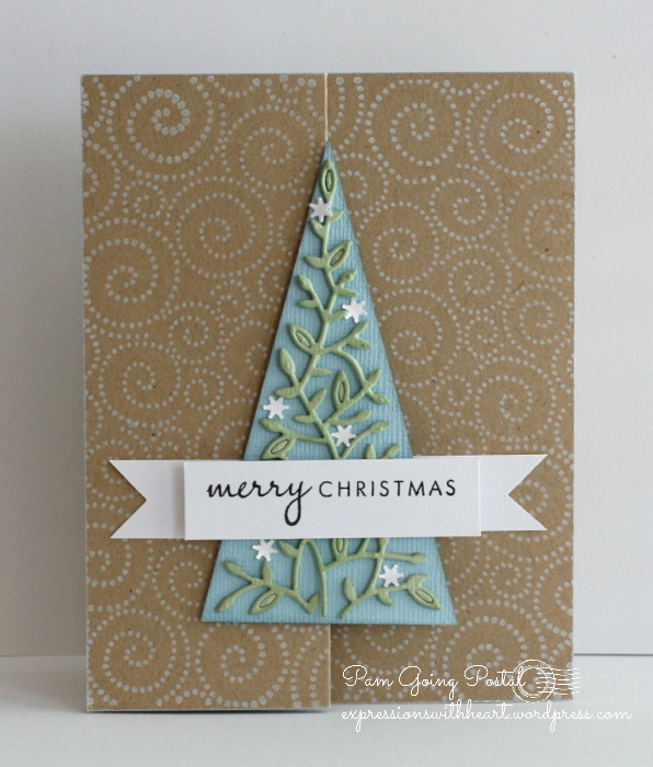 I used the pretty Elyse tree die from Memory Box, HERE and mounted it on a piece of card-stock I just cut with the paper cutter. The background is a Hero Arts stamp. I stamped it with Clearsnap’s Frost White pigment ink on Desert Storm card-stock.