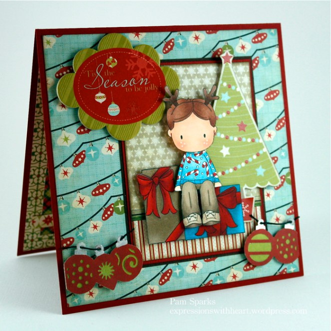 Christmas Trevor is patiently awaiting the moment he can tear into these presents! He’s so cute with his antler headband and candy cane shirt! I colored him with Copic Sketch Markers…check my post from yesterday for the link to Dick Blick’s sale and a great price on Copics! Then in the sidebar on the right… Copic refills HALF PRICE!!! I already ordered what I needed… yea! Hair E 13, 15, 18, 19 … Skin E000, 00, 01 … Shirt B000, 00, 02, 05 …Pants and shoes E40’s …