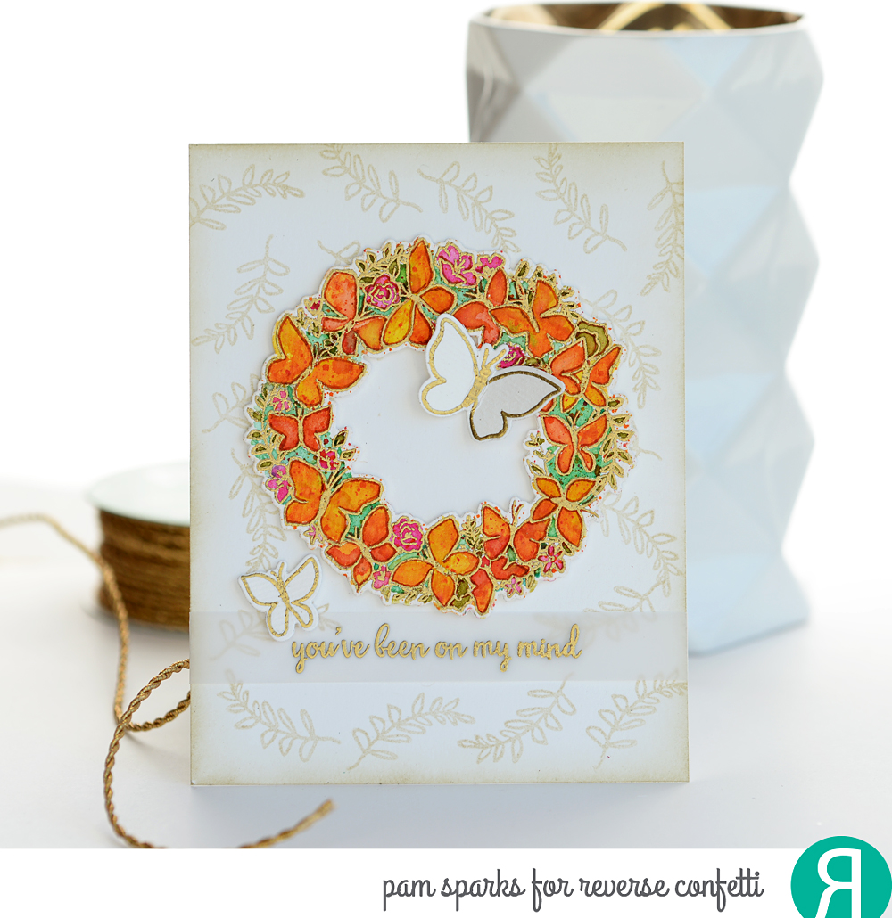 I randomly stamped the branch with old paper Distress ink on the cardbase. Heat embossed the sentiment from the set on vellum. Stamped and heat embossed the two butterflies from the set and adhered them with a little Tombow Mono Multi liquid glue after I adhered the wreath to the cardbase with mounting tape.