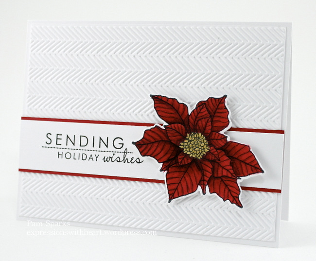 Our stamp club has a card swap each month at our meeting… the second Friday of the month at 1 p.m. if you ever want to come! Links below to the products I used. This is the card I made to swap. Papertrey Ink Poinsettia year of the flower and die. I used the small one out of the set, inked it with Memento Tuxedo Black ink, stamped on PTI white select card-stock and colored it with Copic Sketch markers. The sentiment is from the same set…inked with Versafine Onyx Black ink.