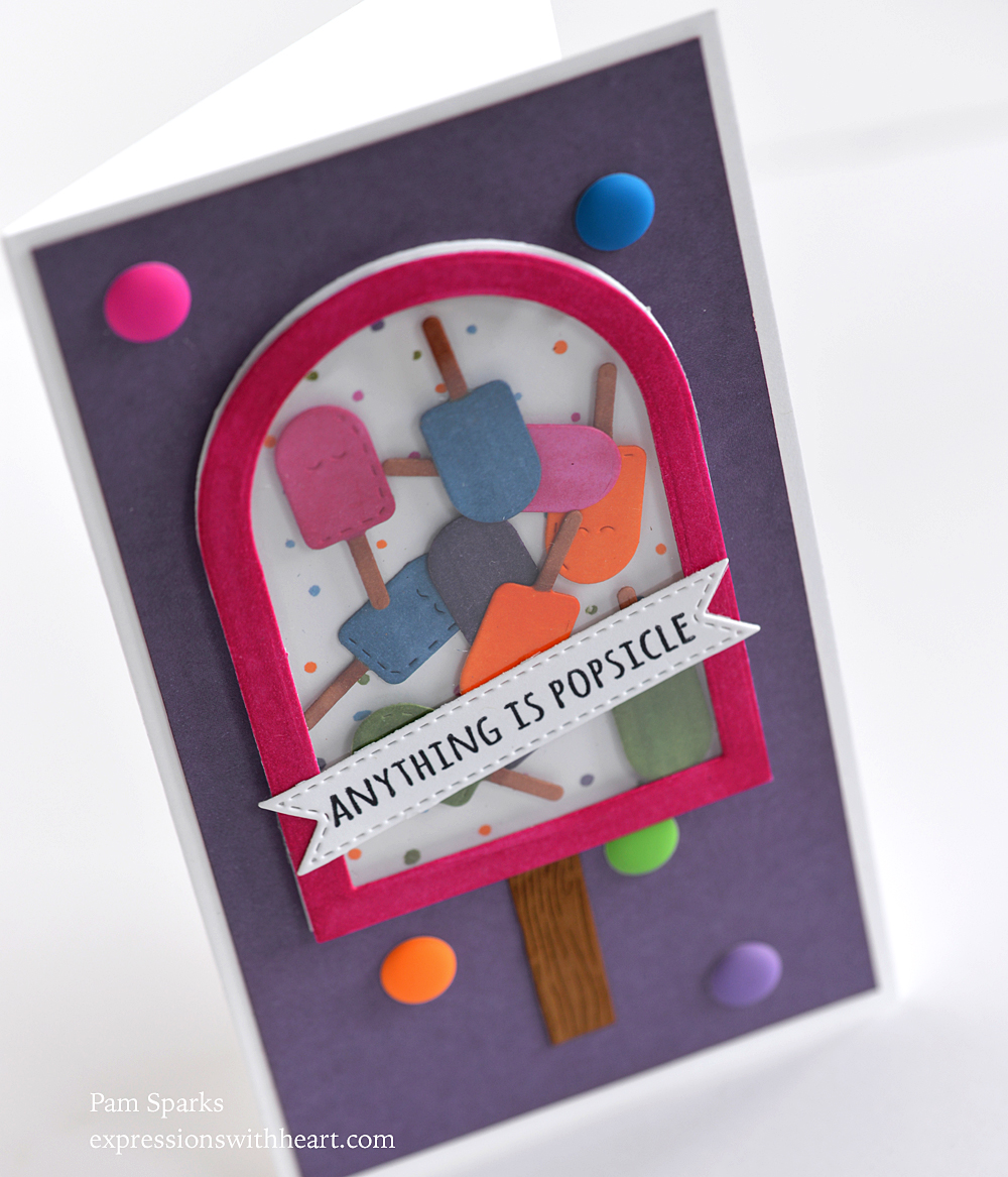 Do you agree? Such a cute sentiment! A Summer shaker card with poppystamps Whittle Popsicle die, Memory Box Nested Globes, Memory Box Grain Planks (cut to be narrower), NEW Banner Sentiment Trio die and NEW poppystamps Life is Sweet Clear Stamp set!