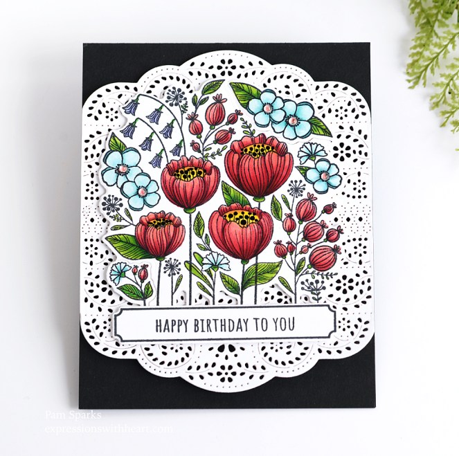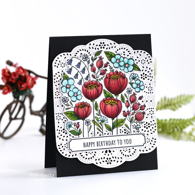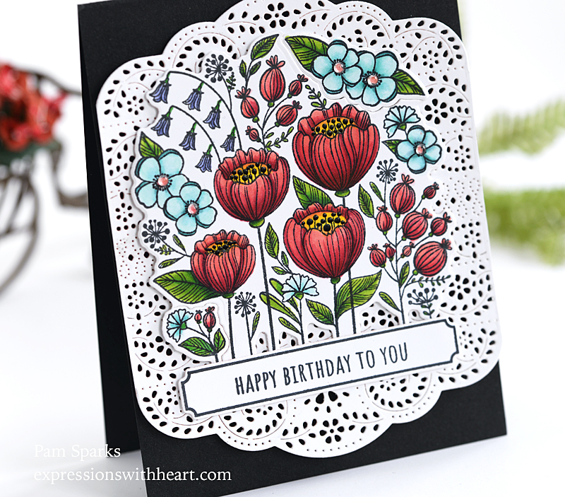 If you look real close you can see I die cut the top right double flower and the bottom left flower and pieced them back in for this card. Those are also the pieces I used to make the wreath… five of each.