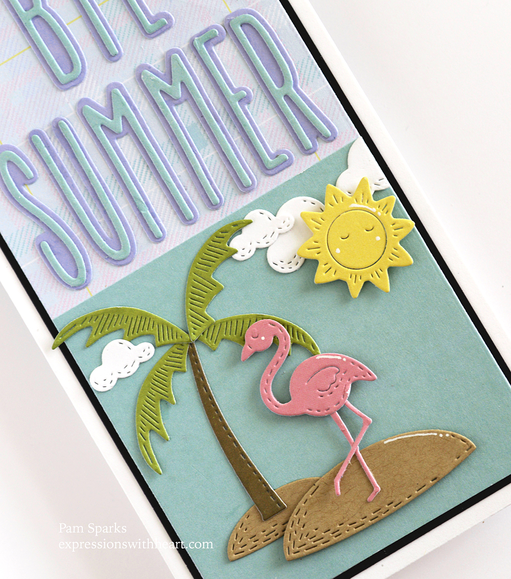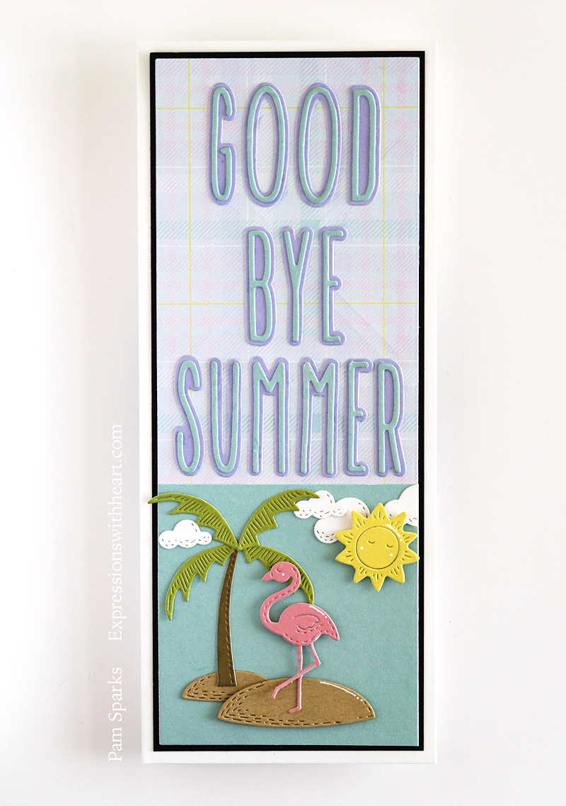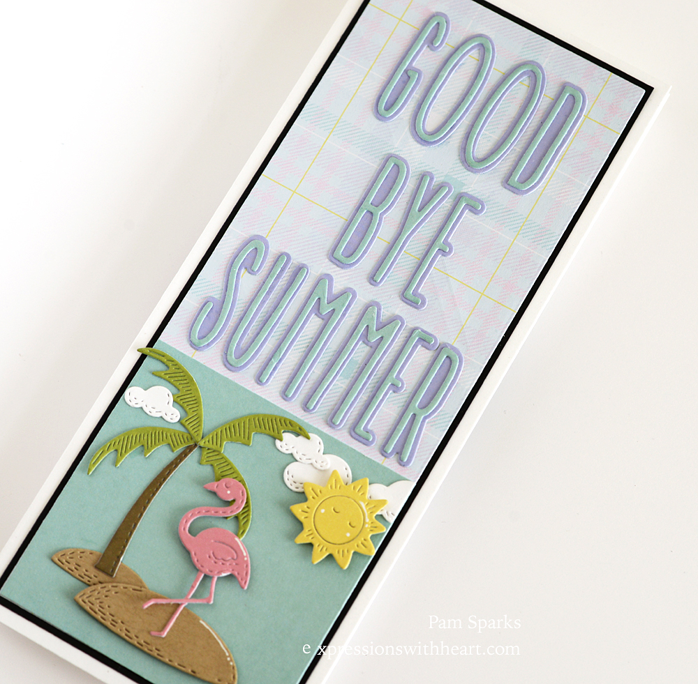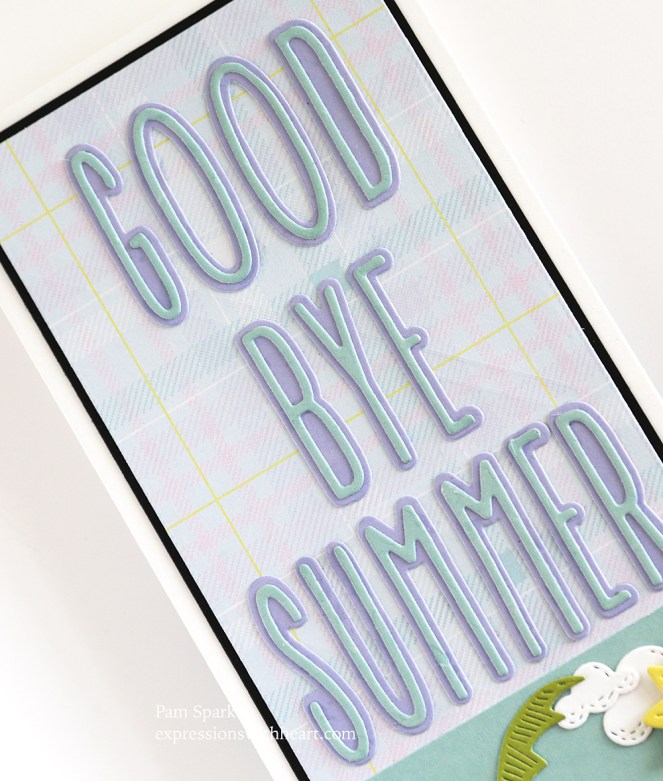 I used one of the pattern papers from the pretty Memory Box Spring Plaid Slim pad and two Memory Box 6×6 cardstock pads, Ocean Blue and Fresh Aqua for the die cut letters.