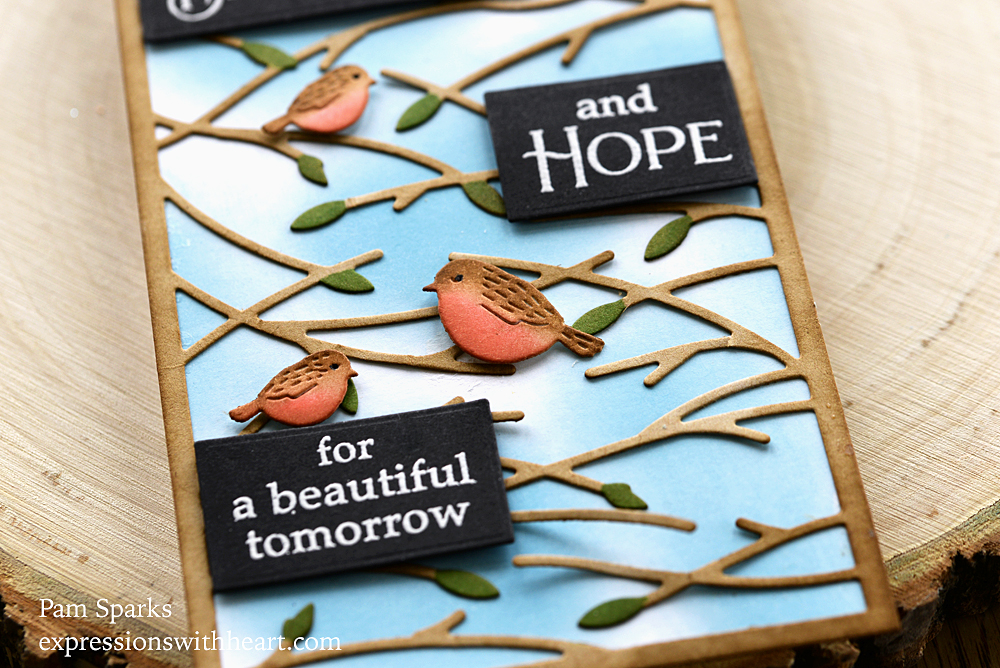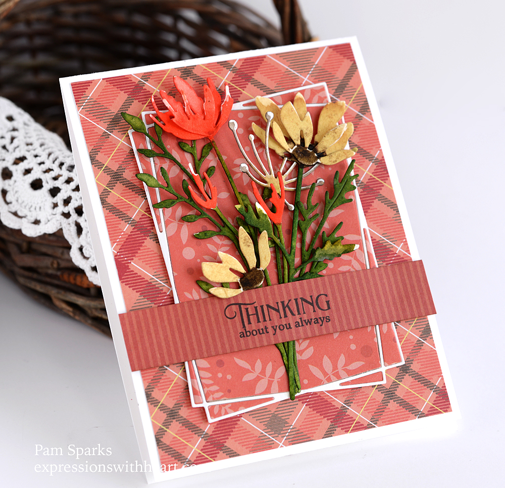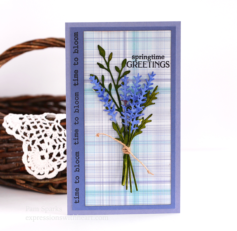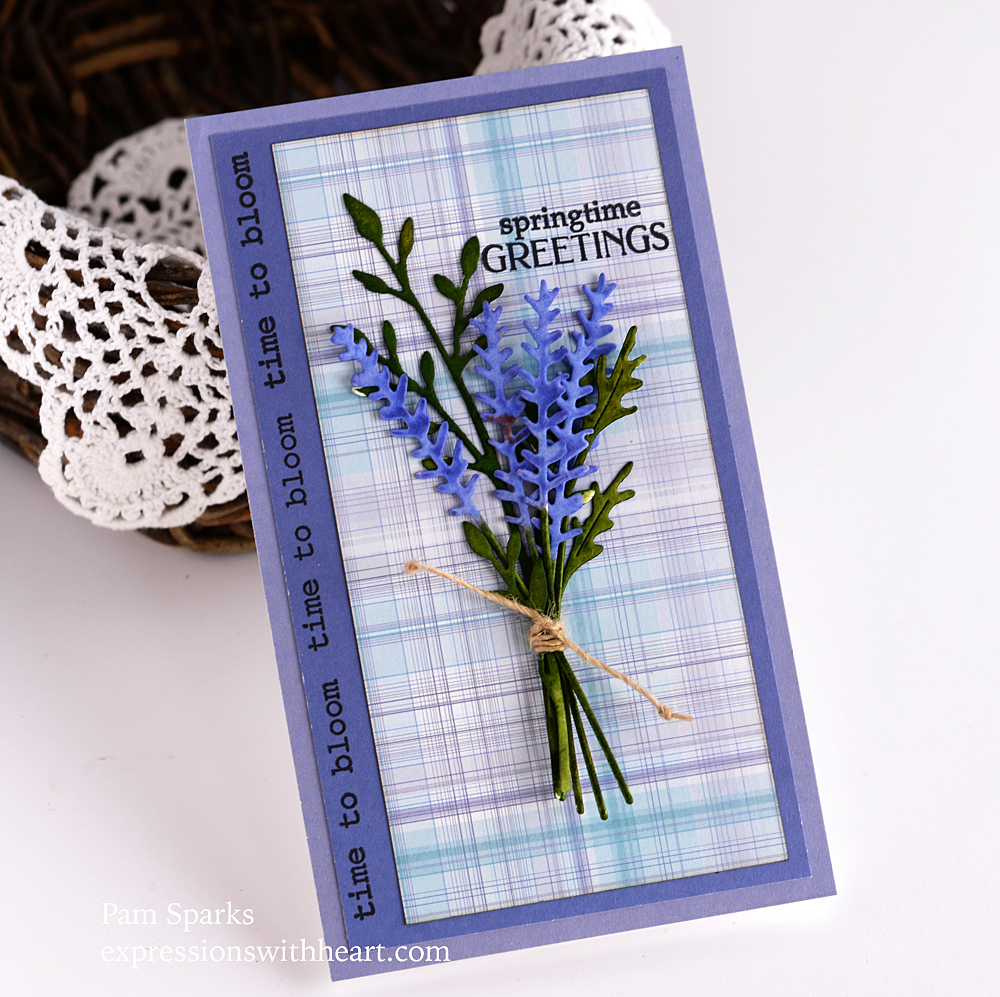 I used one of the pattern papers from the pretty Memory Box Spring Plaid Slim pad and two Memory Box 6×6 cardstock pads, Ocean Blue and Fresh Aqua for the die cut letters.