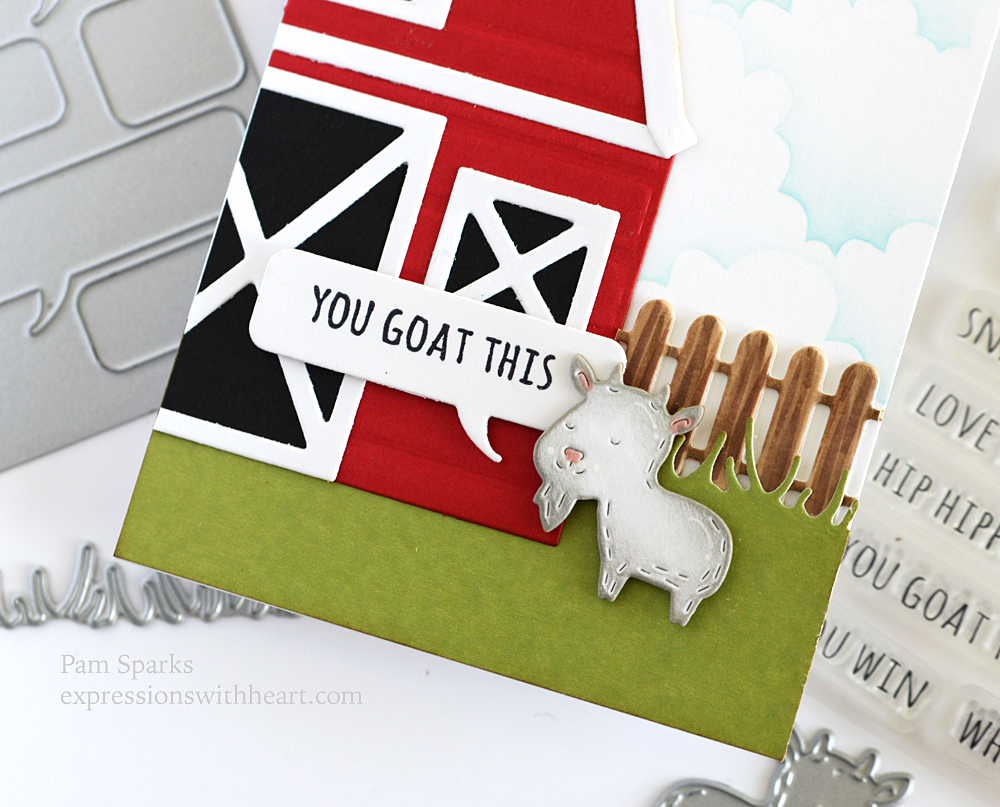 I die cut the Whittle Goat in white Neenah Classic Crest and using my TE gray blending brush for oxides, I just went around it with the brush, no added ink. Then I colored the nose and ears with a pink Copic. This was my third try at coloring the goat. I liked it the best.