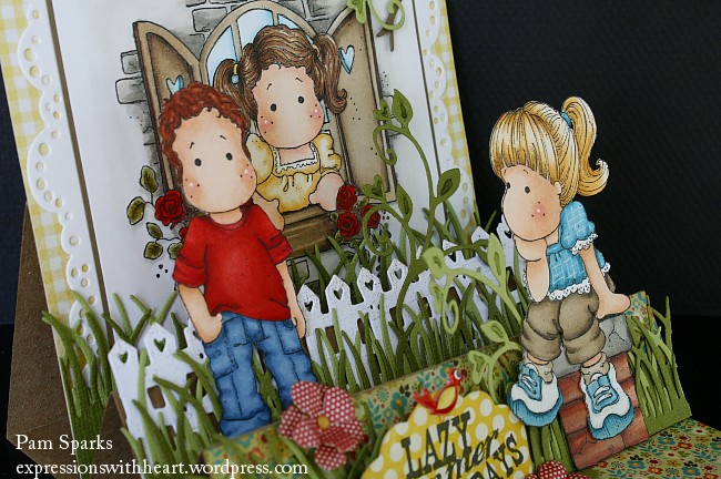Colored with Copic Sketch Markers – Hair YR30, 31, 23, 24 – shirt and socks R81, 83, 85 – pants & shoes E40, 41, 42, 43, 44 – butterfly BG0000, 000, 01, 02. Pattern paper by Jillibean Soup (it’s on sale!). Cardstock is from Prism. Hug Snug seam binding. Sentiment stamps, Versafine ink, Magnolia Dragonfly die, Spellbinders dies, Memento inks applied with ink blending tool to sky (summer sky) and grass (pear tart, new sprout and bamboo leaves) … links below.