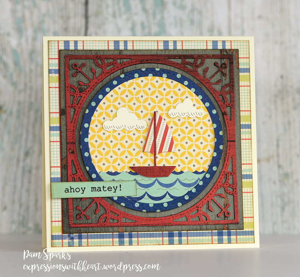 The Sailboat Frame die set, using all the pieces this time, super cute sailboat, waves and clouds! I love the frame die cut in this red wood paper! I die cut the greenish square mat with the Memory Box Square Basics die set.