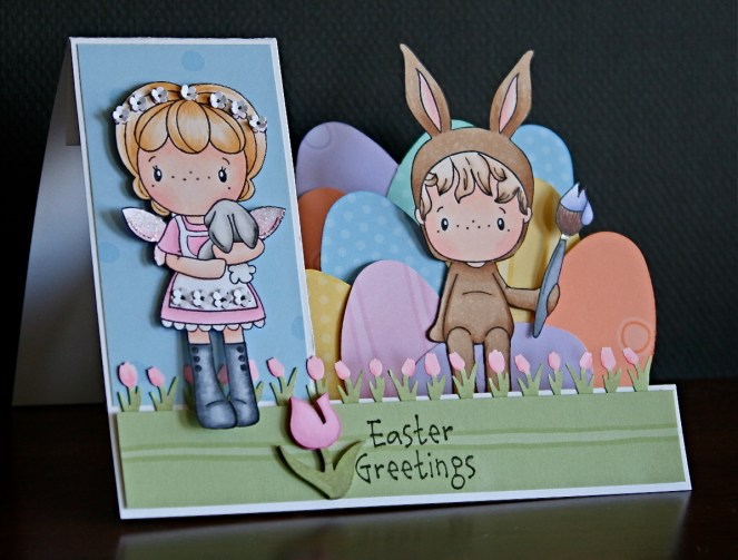 It’s so exciting to think Spring, working with fun Springy colors and today. I’m using Spring Birgitta and Bunny Hansel. Bunny Hansel and Spring Birgitta were stamped with Memento Black ink and colored with copic sketch markers