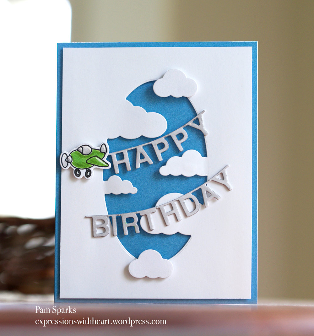 Hi everyone! I’m back today with 3 cards to share. This first one features a sky writin’ airplane from the Flying High Stamp set! So cute…colored it with Copic Sketch markers. The clouds are from the coordinating Flying High die set. I just used the cloud dies from the set without stamping them.