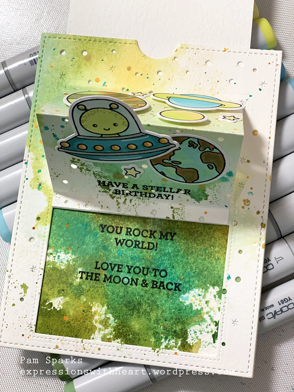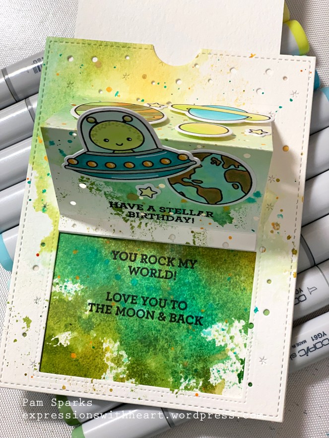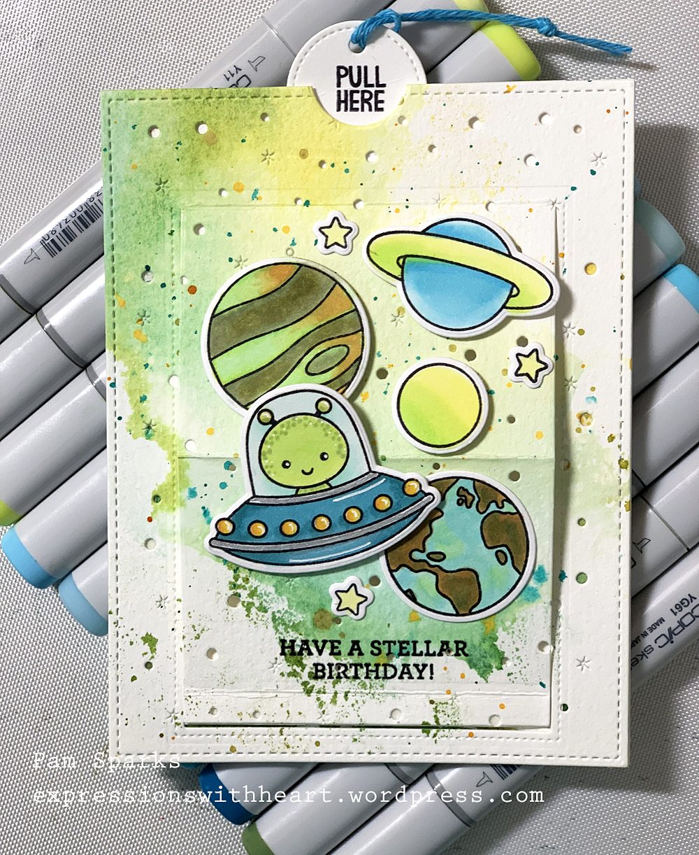 I used An Altenew Alphabet set on the front and the stamps and dies from Sunny Studio and Waffleflower. Here’s another card I used the Batter set for.