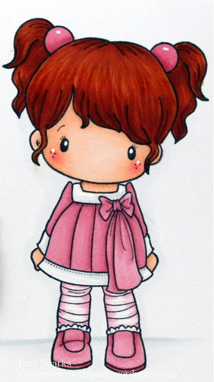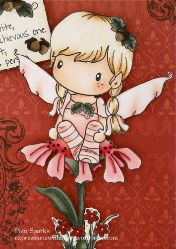 Images are stamped with Memento Tuxedo Black ink. I used some different Copic colors this time…for me anyway! For the pink clothes I started out with R11. Then teeny amounts of R12 and R20. On her Wings I used R0000 all over, then R000, 00, 01 and 02. The greens are BG90’s. The big flower is R20, R43 and R46. The teeny flowers are E24, E07 and E59. Her hair is E50, 51, 53, 55. Acorns are the E40’s.