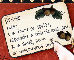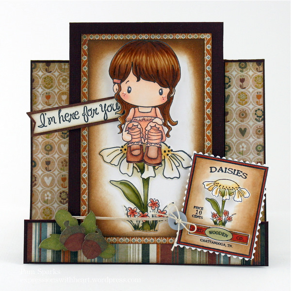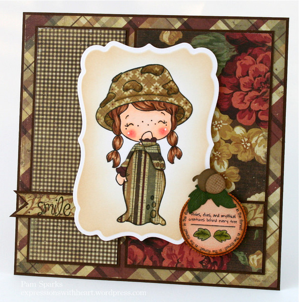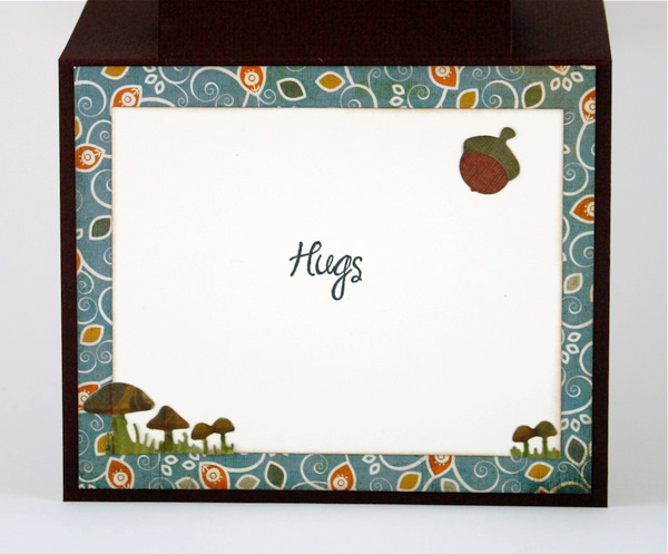 LOVE the Woodland Daisy “seat” and AmyR Stamps Be Happy sentiments…”just sitting here thinking of YOU”! (stamped with my trusty stamp a ma jig…LOVE that thing!) Check out the super tiny acorns on the Woodland Pixie Logo… I cut out a couple and popped them up!