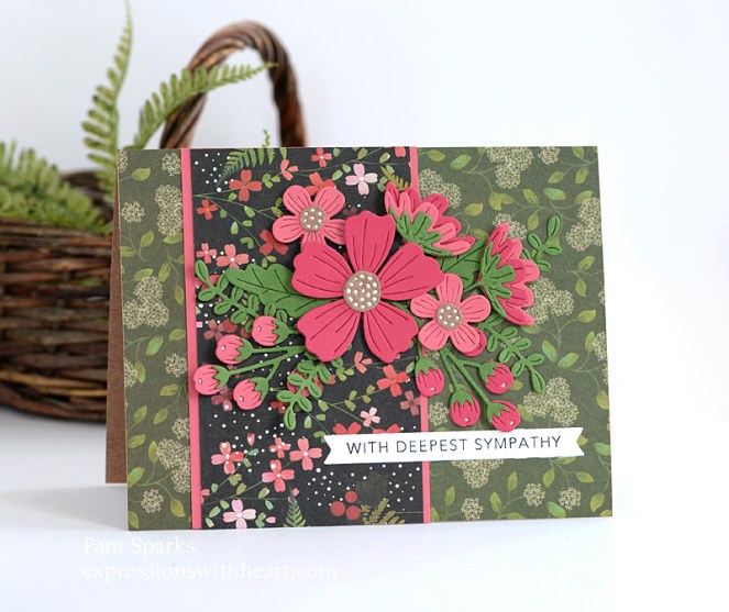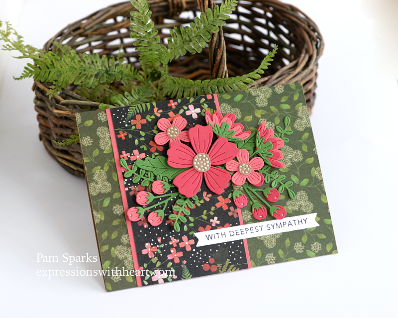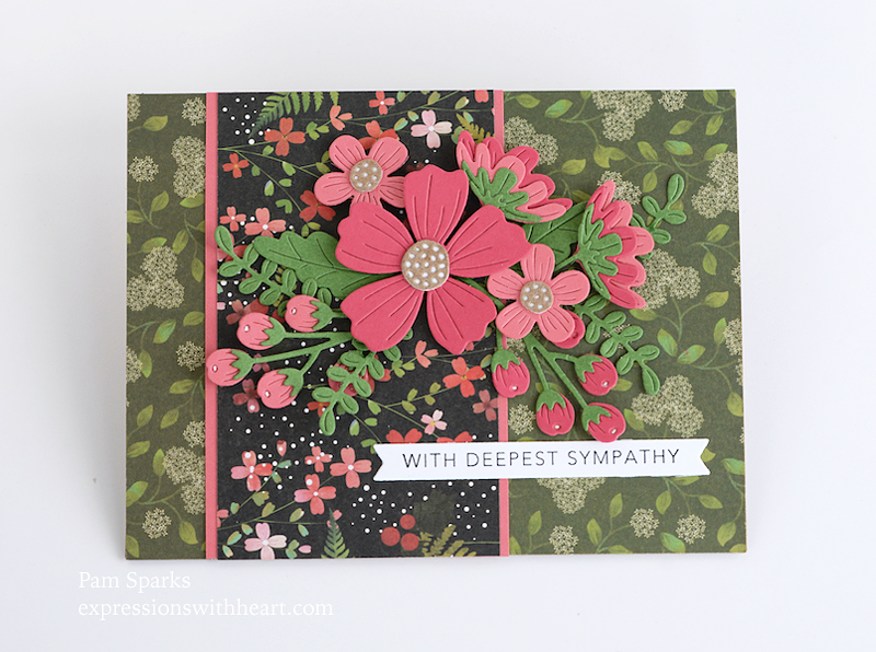 I used an old Memory Box postage rectangle to mat a panel of paper from the Glimmering Gladiola 6×6 pad.
