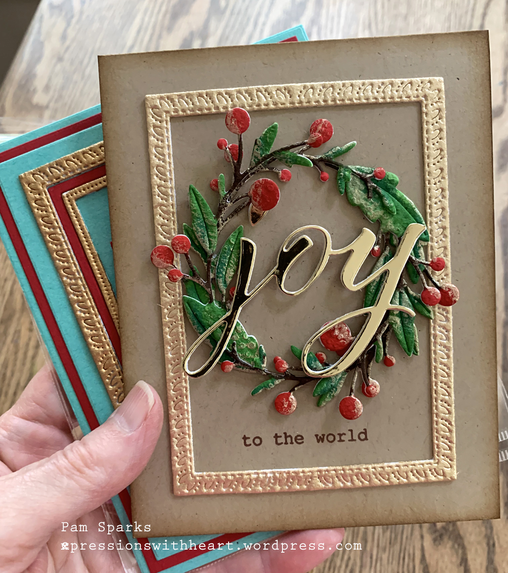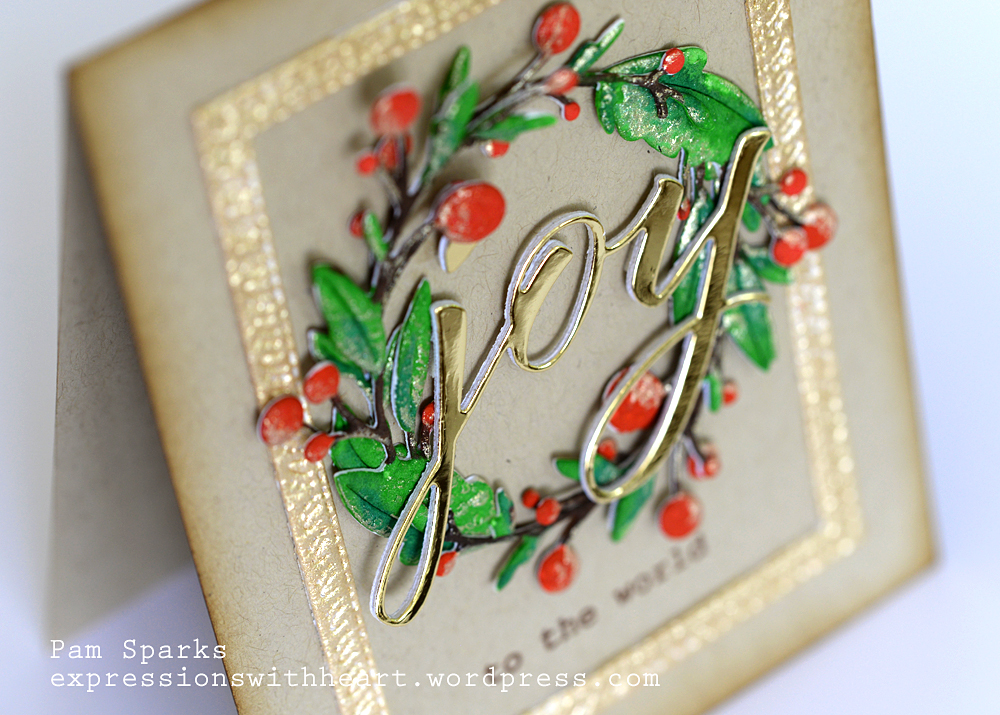 I adhered the diecut NEW Joy Airy Script die from Gold Mirror Cardstock and using mounting tape cut in narrow strips I stuck it to the inside of the wreath.