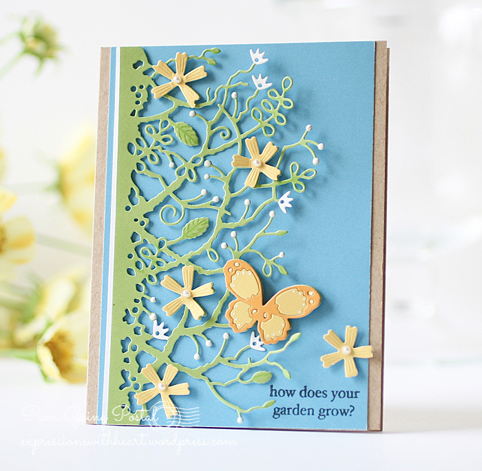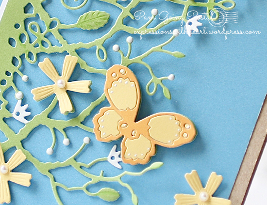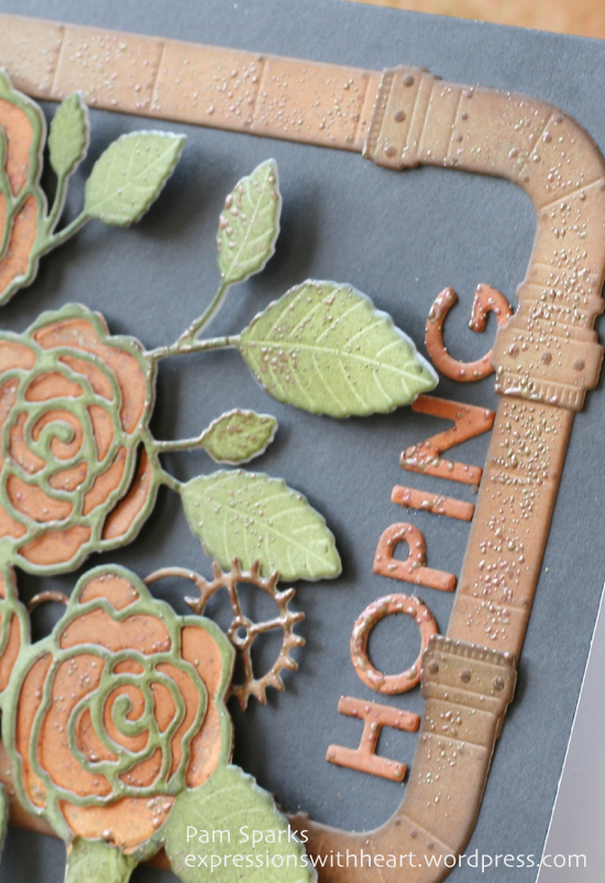I die cut the Pennington Rose Border die in white card-stock but just used the right end and one other rose from the cut to embellish above the banner. I added a few enamel dots in green. I love the fun touch the dots add to the mix.
