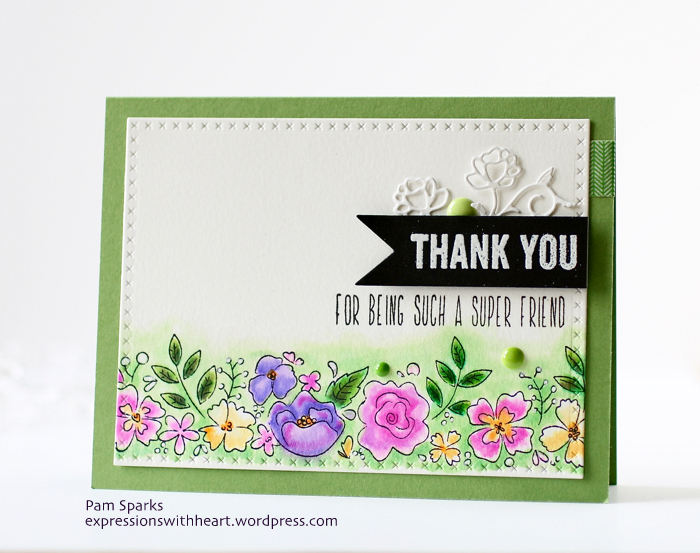 I embossed the poppystamps Thank You sentiment with super fine white embossing powder on a black banner from the poppy Classic Ribbons die set and stamped the friend sentiment directly on the watercolor paper with the MISTI stamp tool. Both are from the Hope and Thanks set.