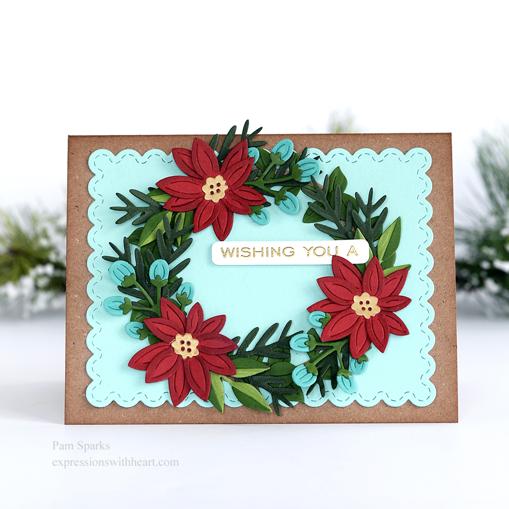 I enjoyed working with the ‘parts’ from this new Christmas Foliage die set.  Everything for the wreath is from this set! I die cut threes and fives of each piece.  Then cut a circle frame to use to keep me in a circle shape while gluing the pieces on.