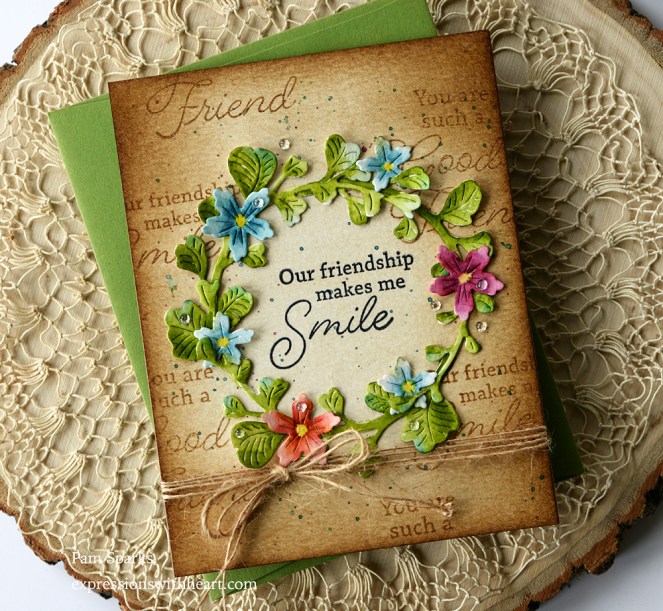 Now we’re going to ink the wreath with Distress ink. In my picture I grabbed regular Distress ink but when I was making my card, I used Distress Oxide Rustic Wilderness. ugh. My regular are out in plain view and my oxide are in a drawer now. Change is hard! lol I used my oxide brush with regular ink. There go my eyes rolling at myself again!