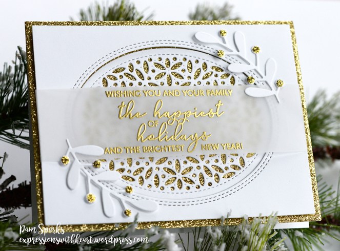 I heat embossed the sentiment from SSS Inside Christmas Greetings clear stamp set on a piece of vellum with Ranger super fine detail gold embossing powder.
